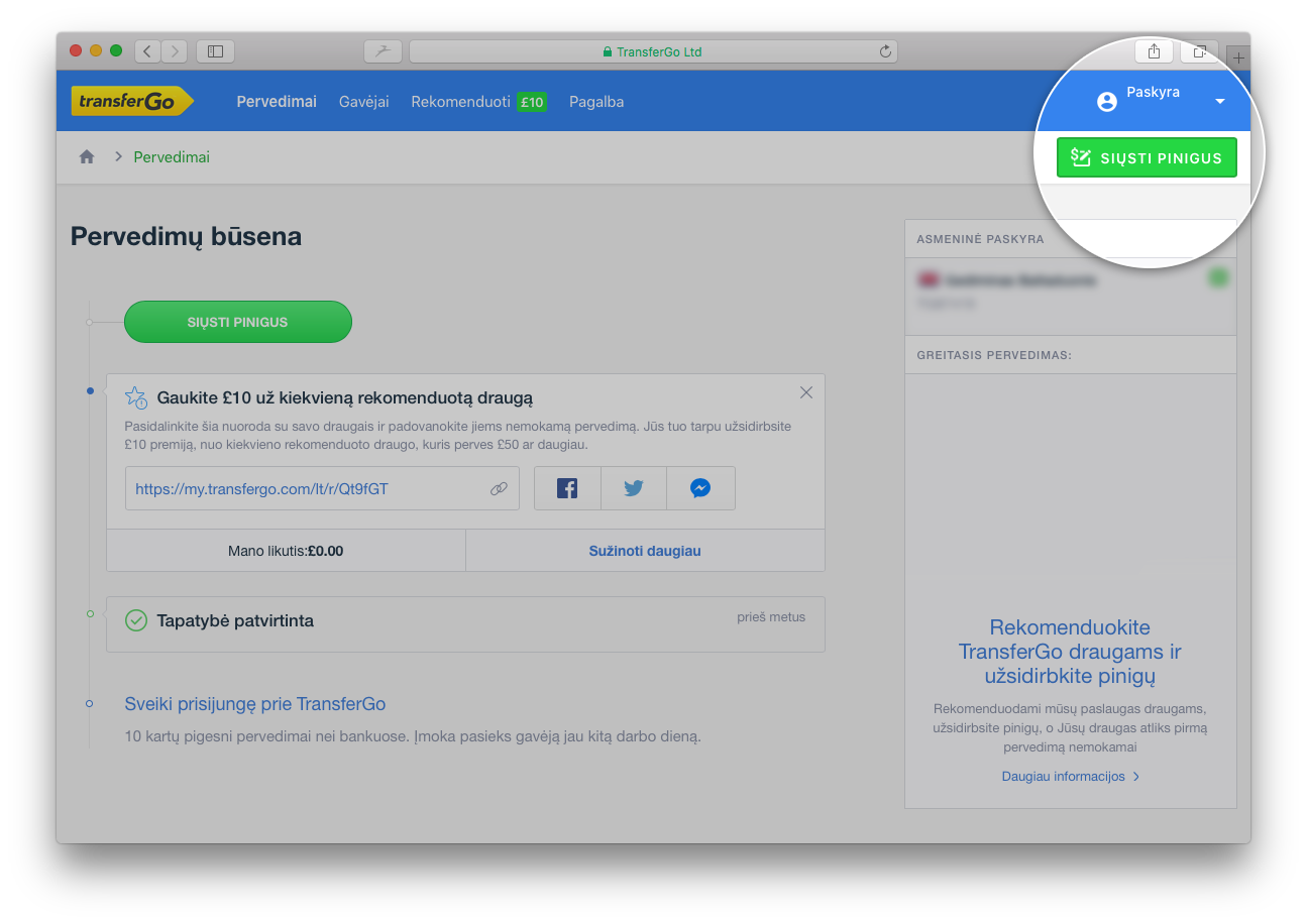Mes žinome, kad kai siunčiate pinigus namo, tarkime, kaip dovaną draugams ar giminaičiams, norėdami apmokėti sąskaitas ar kaupti santaupas, Jūs norite būti tikri, kad suma, kurią siunčiate, pasieks gavėją nepakitusi. Būtent todėl TransferGo užtikrina, kad, paspaudus „Siųsti pinigus“, valiutos kursas yra užfiksuojamas (valiutos kursą galėsite matyti pervedimo suvestinės lange, dešinėje puslapio pusėje).