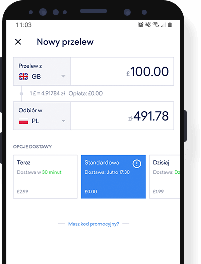 Przesyłaj pieniądze do innych krajów w 30 minut, także w weekendy.