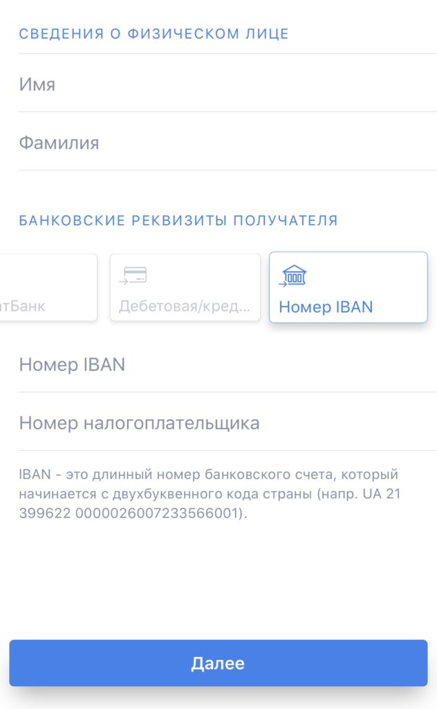 - Добавляете информацию о получателе: имя и фамилию латиницей, IBAN и номер налогоплательщика (идентификационный номер плательщика налога)