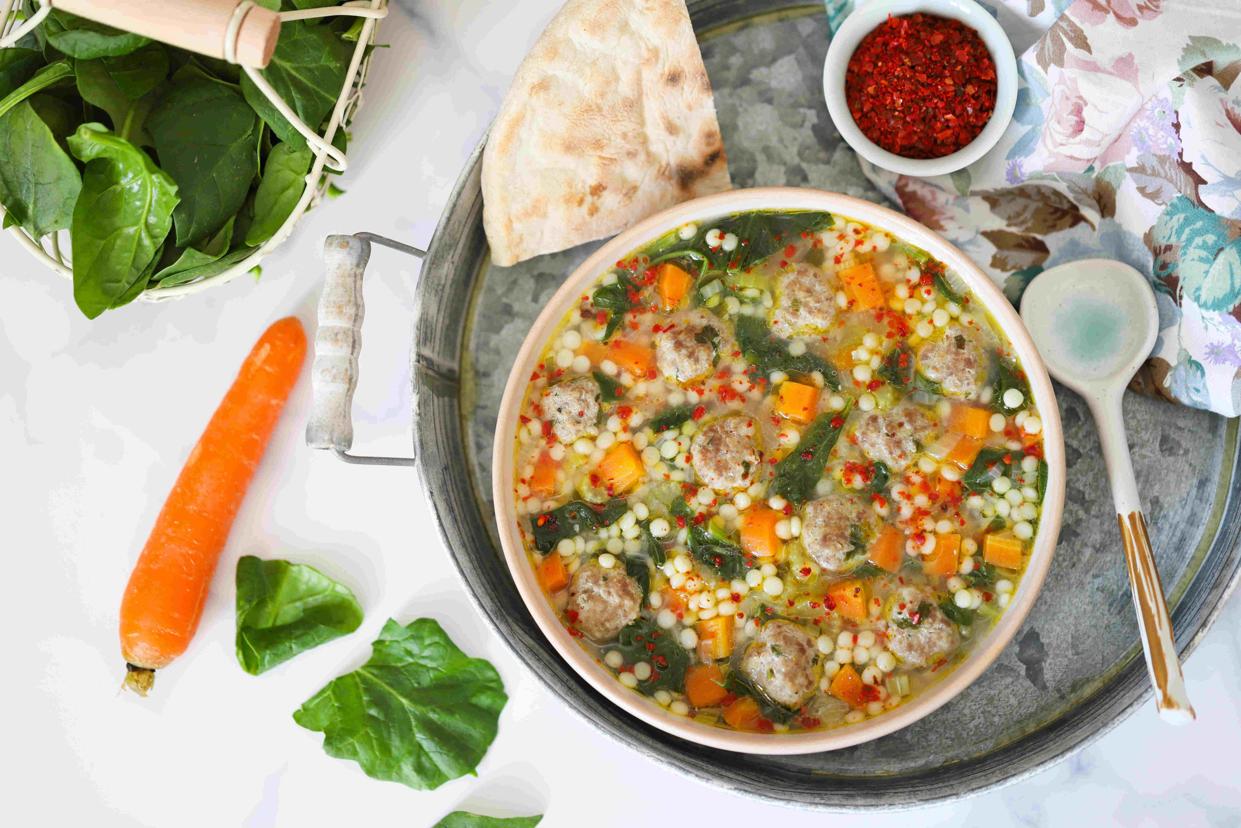 Bu çorbayı Türk mutfağına uyarlarken birkaç küçük değişiklik yaptım. Öncelikle makarna yerine kuskus tercih ettim. Amerika’da da wedding soup için kuskus kullanılıyor ve çorba beklediğinde hamurlaşmadan diri kalmasını sağlıyor. Böylece her kaşıkta taze pişmiş gibi bir doku elde ediliyor.